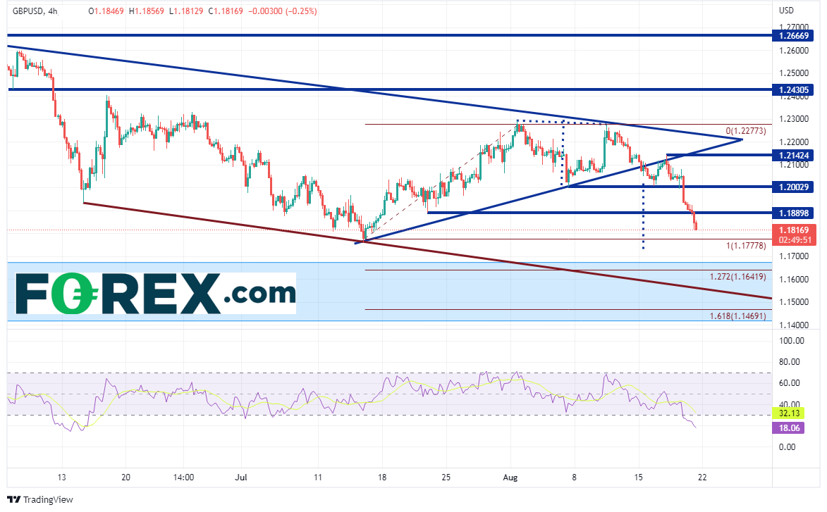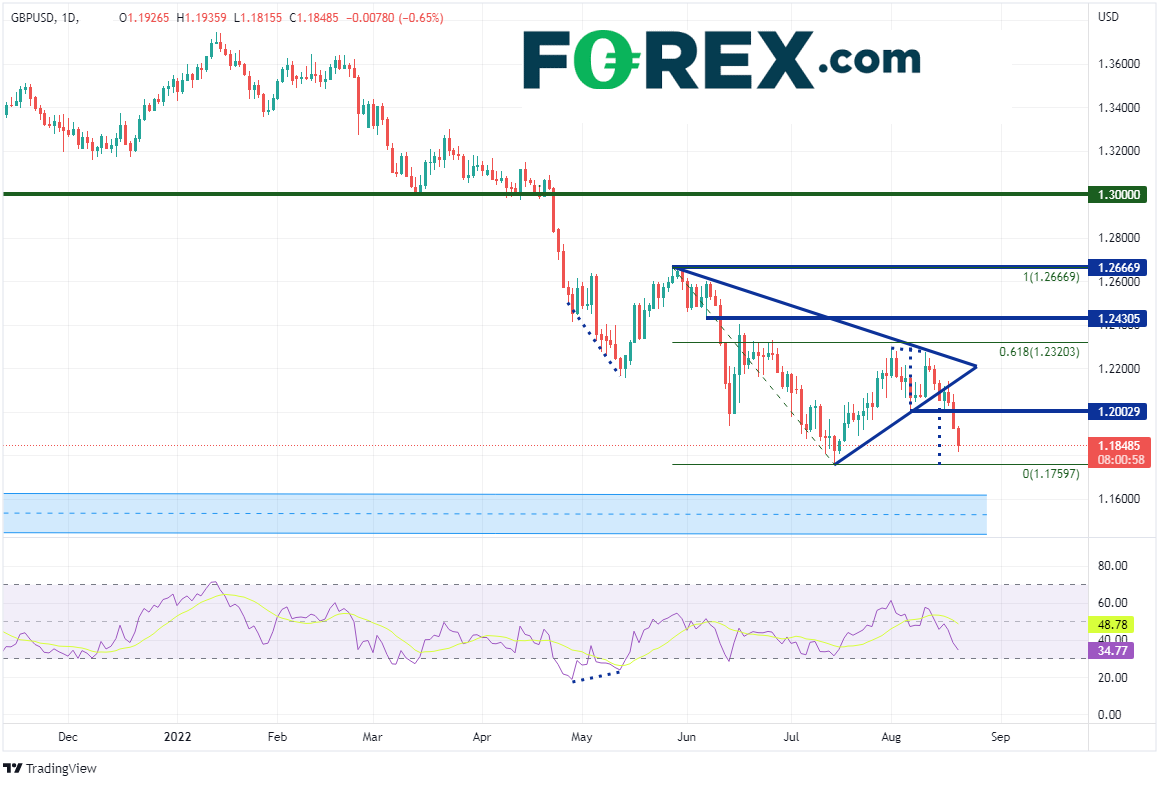 英镑/美元在20216月创下1.4250高点后开始下跌,于4月大举下破1.3000的心理整数关口,低至1.2155,后因RSI和价格背离而回升至1.2660。该货币对之后走出对称三角形,该形态被视为延续形态。价格逼近形态尖端的过程中形成双顶,并于815日在1.2100附近下破对称三角形。几天后的818日,价格下破双顶形态的颈线1.2003。双顶形态突破后的目标为突破位加上形态高度,本例中在714日低点1.7587附近。但最新揭晓的、积极零售销售数据不足以压制生机勃勃的美元多头,英镑/美元因此跌至715日以来最低点。