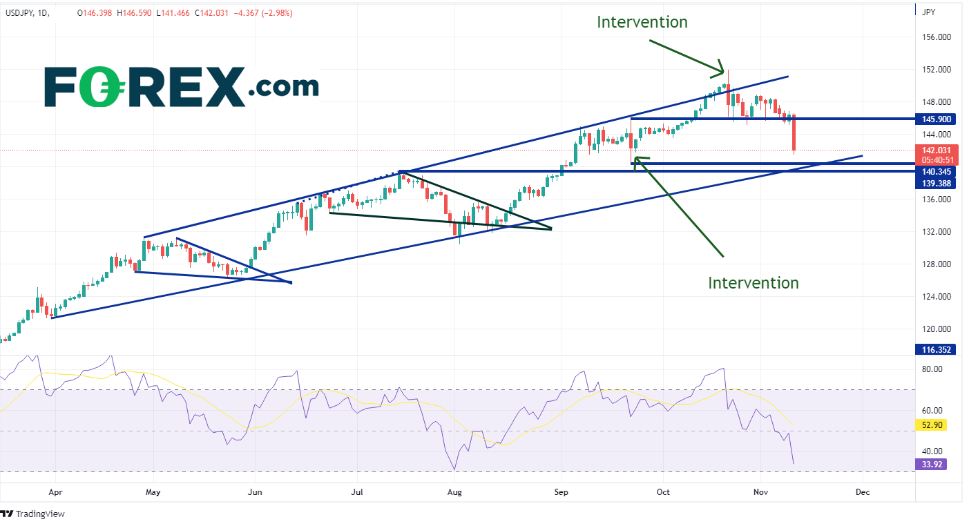 在日线图,美元/日元由于出现了与往常相比的巨大抛售,已经回落。日本于922日首次干预外汇市场,当时市场仅下跌了175个点,跌幅为1.22%1021日,财政部再次干预外汇市场,这次将美元/日元压低了250个点,跌幅为1.65%  如果当前的抛售持续下去,它将比干预能更有效地加强日元。今天,该货币对下跌了464个点,跌幅为3.18%(截至撰写本文时)有一个三重支撑分别在922日低点140.35附近,长期上行通道的下沿139.80附近,以及715日高点139.39阻力位在1027日低点145.10
