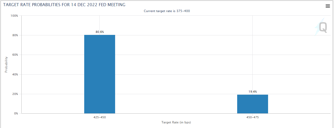 现在市场注意力转移到了美联储,降低的通胀率是否给美联储12月“只”加息50个基点打开绿灯?6月以来,CPI同比增速节节下滑,从9.1%8.5%降至8.3%8.2%,如今直接跳至7.7%。同时联邦基金费率从2022年初的0.00%/0.25%升至目前的3.75%/4.00%。那这是否意味着美联储激进加息的措施开始起效?美联储在FOMC会议声明中强调:“在决定加息步伐时,委员会将考虑货币政策的累计紧缩、政策对经济活动和通货膨胀的滞后影响以及经济和金融进展”。市场因此认为,美联储希望放缓加息速度,来观察此前加息是否开始发挥影响经济的效果。在会后的新闻发布会上,美联储主席鲍威尔则指出:“把利率提高到多高水平比货币政策收紧步伐更重要。”换言之,最终利率水平比FOMC加息幅度是50个基点还是75个基点更重要。结合今天公布的通胀数据来看,美联储很可能在12月加息50个基点。根据芝商所“FedWatch”工具,在CPI公布后,市场认为12月加息50个基点的概率暴涨至80%!