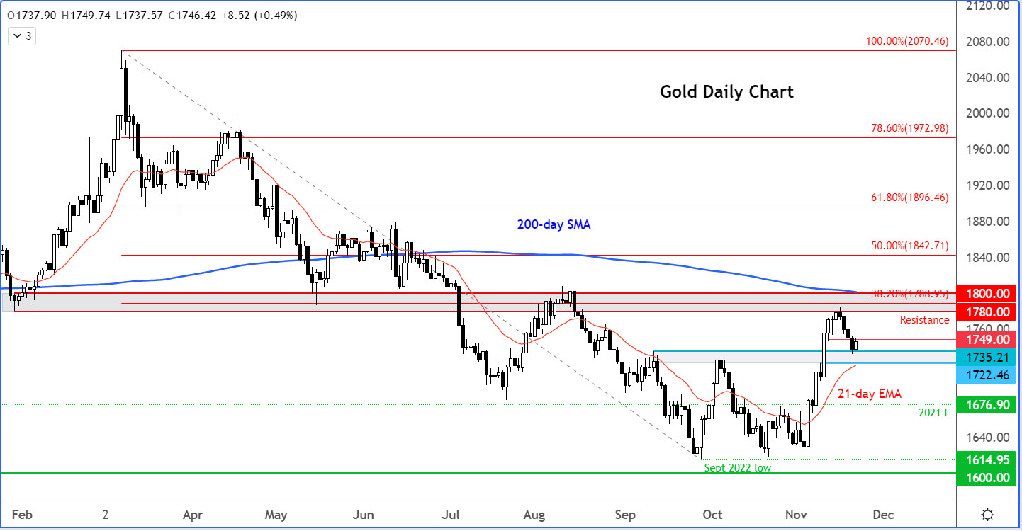 在上周进入1780美元至1800美元之间(红色区域)长期转向区域附近的阻力位后,黄金触及短期支撑位1722美元至1735美元之间的区间上轨(图中蓝色区域)并实现反弹。下一次突破口位置将决定未来走势。截至撰稿时,黄金正测试1750美元下方的短期阻力位。
