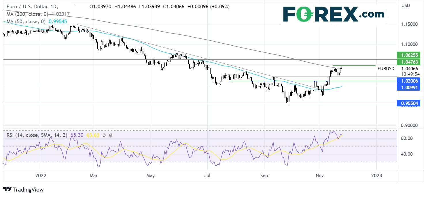 欧元/美元延续昨日的涨势继续走高。鹰派立场减弱的美联储会议纪要和弱于预期的美国商业活动数据正在拖累美元。美国今天因感恩节公休假日休市,因此成交量会很少。