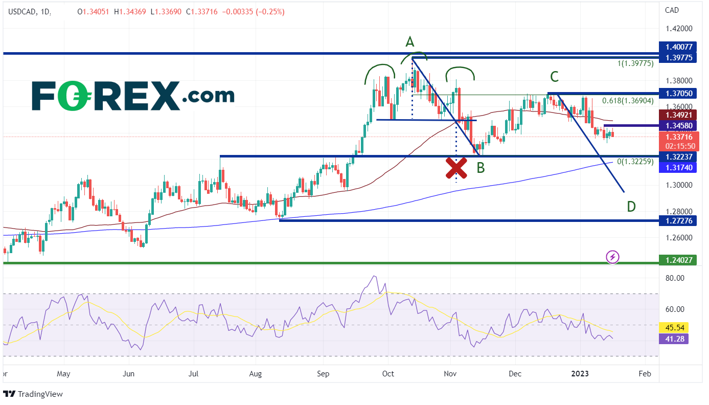美元/加元自2022年以来缓步上涨,并在去年915日突破阻力位1.3223。随后,货币对快速上跳至2022年高点,在1013日上探1.3976。货币对由此形成头肩形态,但未能成功突破实现目标。美元/加元从20221013日高点反弹至61.8%斐波那契回档位,触及前支撑位1.3690,形成目前的AB=CD形态。而该形态目标接近1.2950点。
