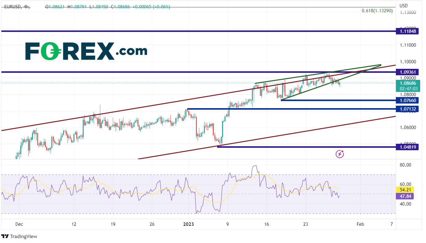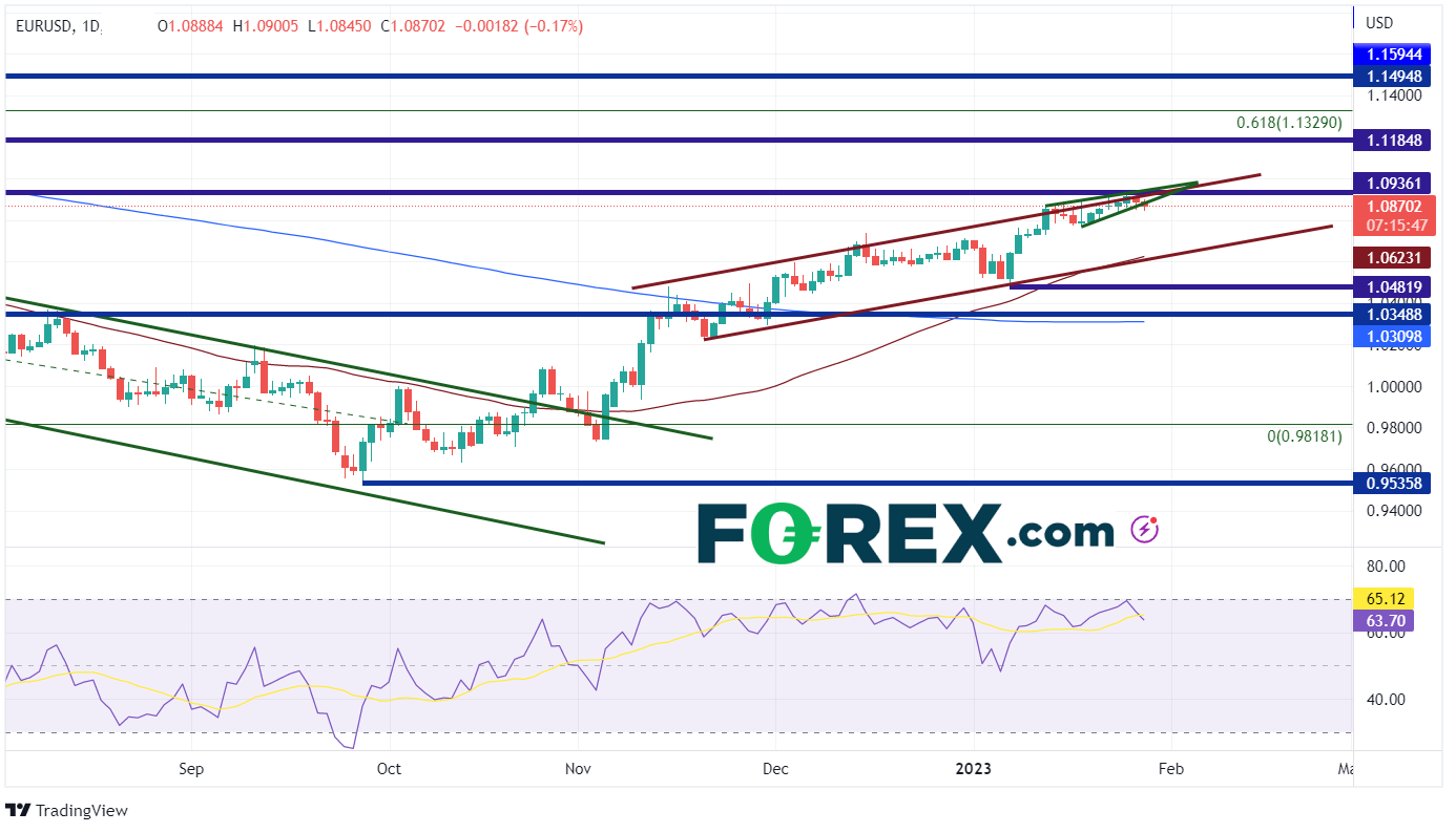由于数据全都在意料之中,美元在数据公布后几乎没有动作。正如我们在之前的文章中所讨论的,欧元/美元在2022928日触底0.9536后,持续走高。11月中旬,该货币对开始在狭窄的上行通道内移动,保持在50日移动平均线和水平阻力位1.0350上方。该货币对目前在通道的顶部趋势线附近振荡,并形成上升楔形,因为欧元/美元遇到了2022421日的高点1.0936附近的水平阻力位。