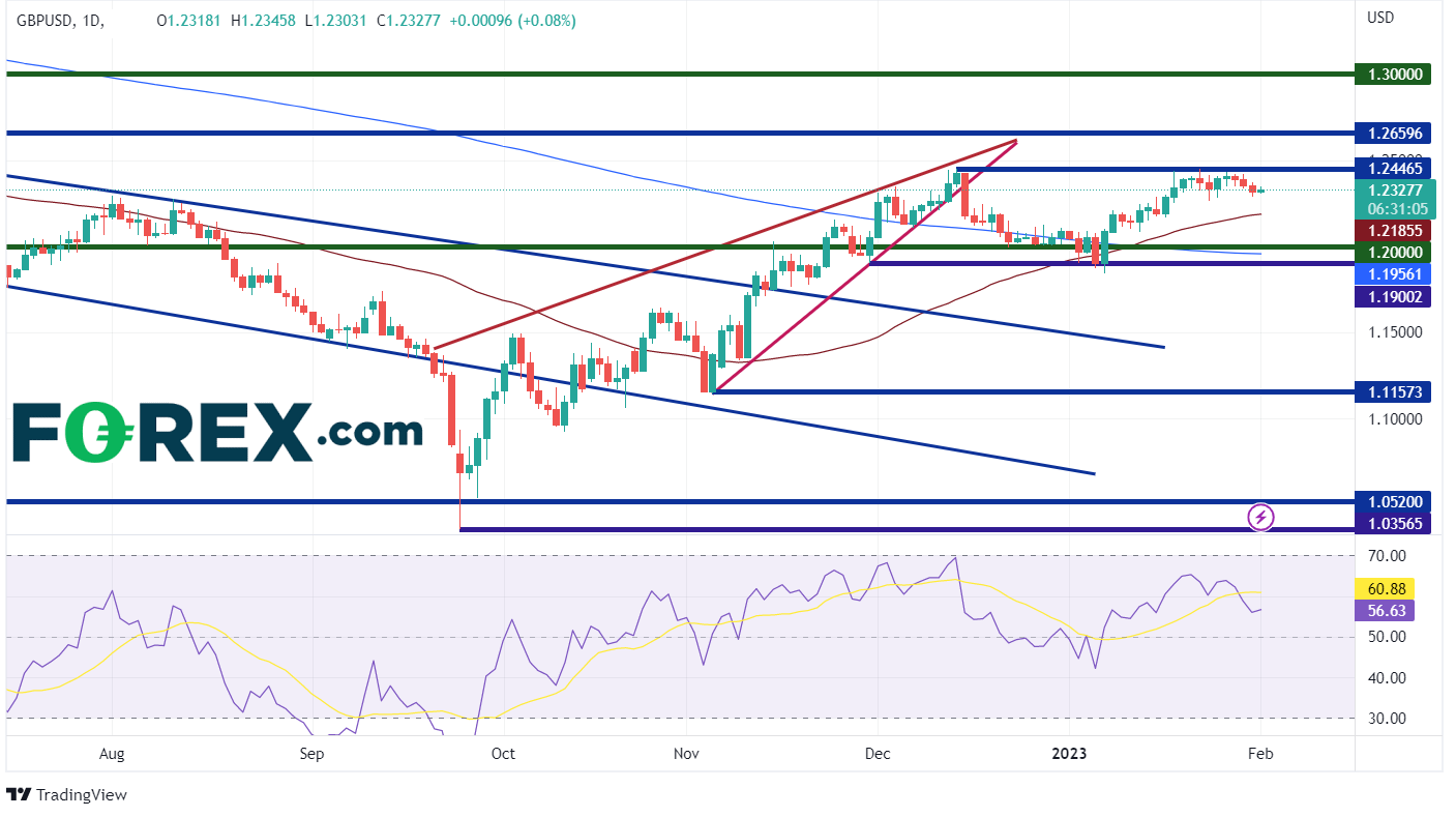 在4小时图内,英镑/美元恰好徘徊在1.2300附近的水平支撑上方。 如果美联储发出就业市场强、工资水平高、整体通膨的信号,英镑/美元应出现下行趋势。 第二档支撑位落在1月24日低点1.2263。 由此向下,货币对价格可能下行至50天移动均线1.2185(见日线图),随后下探1月12日低点1.2084。 倘若美联储发出加息措施成功发挥效果的信号,甚至可能在3月暂停加息,英镑/美元或会进一步走高。第一个阻力位可能在1月23日1.2410附近的下行趋势线出现,由此向上会在1月23日的高点1.2447遭遇阻力。继续向上,货币对价格可能触及2022年5月27日高点1.2667。
