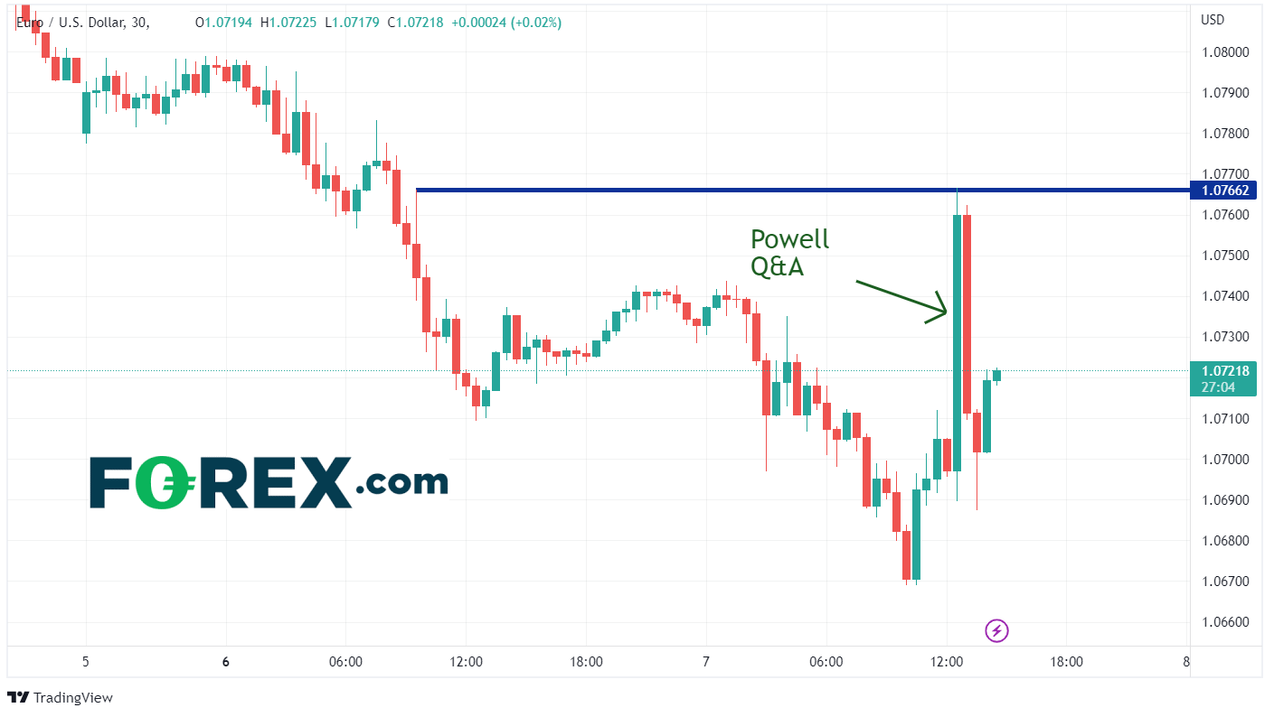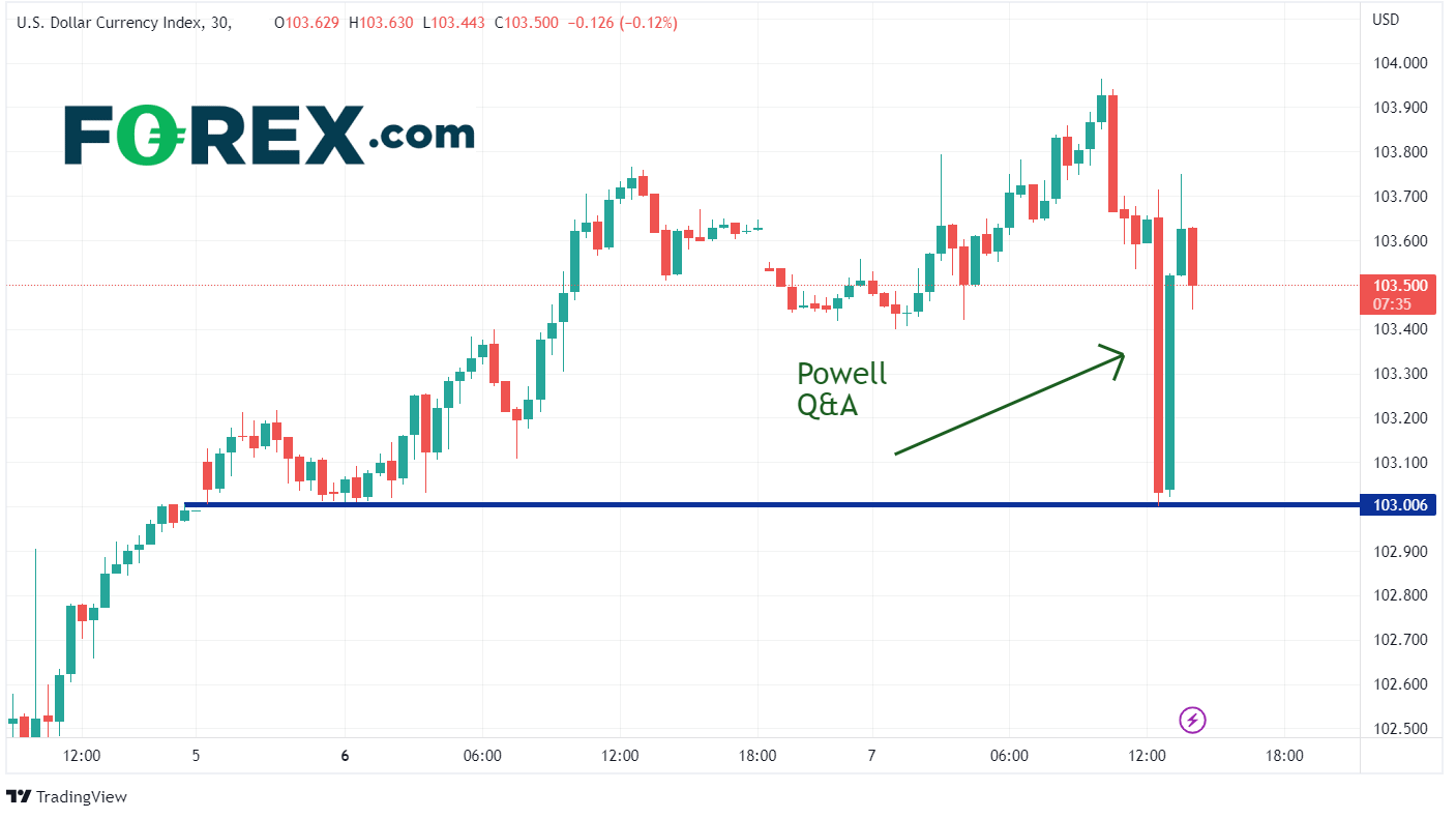 美元指数最初遭到抛售,因为鲍威尔坚称反通货膨胀进程已开始。市场视此为鸽派论调(就像上周FOMC会议后的新闻发布会一样)。请注意,DXY一度跌至上周末之后的跳空缺口和支撑位。然而,当确认非农报告对美联储的未来行动没有任何影响后,DXY回升至鲍威尔开始讲话时的同一点位。总的来说,DXY30分钟内从103.65下跌到103.00,然后在接下来的1小时内反转走势并一路反弹至原点(甚至更多)。