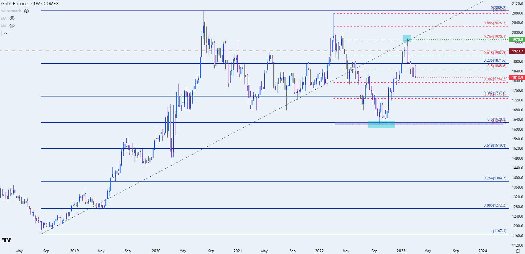 - 50%斐波那契点位落在1628,该点位在9月、10月和11月分别经受了三次考验。随着人们开始期待美联储可能会温柔对待市场,黄金多头重新入场,价格从11月低点上涨到2月高点,涨幅达22.05%。就在那时,76.4%斐波那契点位开始发挥作用,引发市场抛售并守住高点。