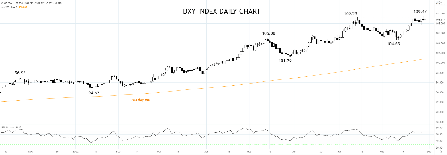 美国2年期债券收益率最高上涨10个基点,至3.48%,反映了9月加息75个基点的可能性上升,并且助涨了美元指数,使其报在20029月以来最高点109.47