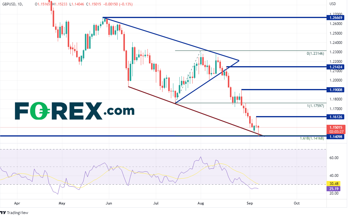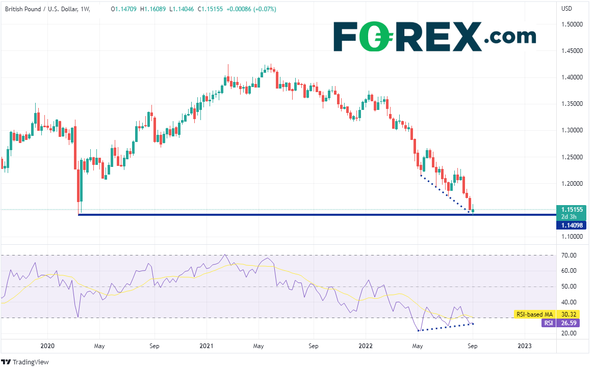英镑/美元周图跌破2020年3月以来低点1.1411附近,上次下破还是在1985年,当时最低触及1.0520。但请注意,RSI随着价格创下三个下降的低点而形成三个上抬的低点。这通常暗示价格可能反转。