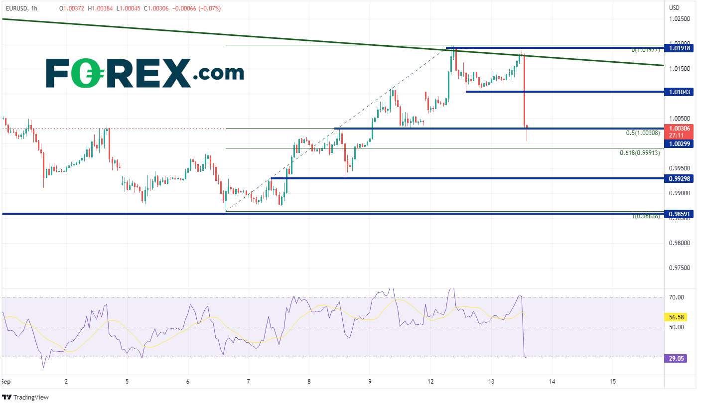 受高于预期的CPI数据的推动,美元暴力跃升。欧元/美元小时图此前一直交投于长期下降通道的上轨趋势线(请看图中绿色线)附近,即1.0200下方。CPI数据甫一发布,价格旋即下破9月6日低点到9月12日高点行情的50%回档位,即1.0031附近。短线支撑在前述行情的61.8%回档位、水平支撑位0.9930和9月6日低点0.9859。盘中阻力位先后在1.0104和近期高点与通道上轨趋势线1.1098。