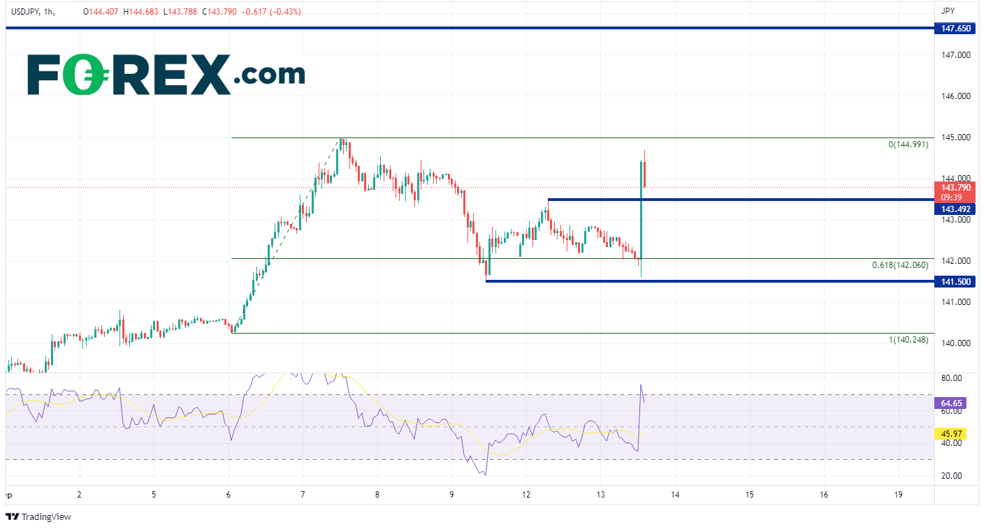 CPI数据发布引起的美元货币对的暴力走势中,最引人瞩目的货币对是美元/日元。此前价格一直交投于9月6日低点到9月7日高点行情的61.8%回档位,即142附近。数据甫一发布,价格旋即冲高至144.68,斩获近270点子的涨幅。请注意,短线图表上RSI马上进入了超买区域,预计日内价格回撤(目前已回调近90点子)。下方盘中支撑位有水平支撑位143.49、今天低点141.59附近。上档阻力先后有9月7日高点144.99、1998年高点147.65。