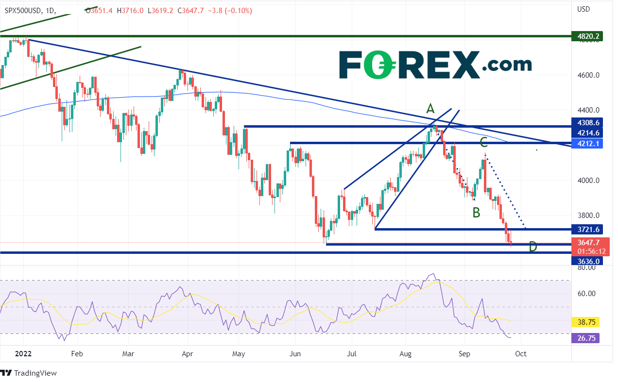标普500指数在616日创下3638.8低点,之后回升并形成上升楔形形态,816日摸至水平阻力位兼200天均线4308.6附近。自那以后,这个大盘股指不断下跌,形成AB=CD形态,到达前行情的100%回档位。价格在周一继续下跌,并在周二于3620.2创下年内新低。