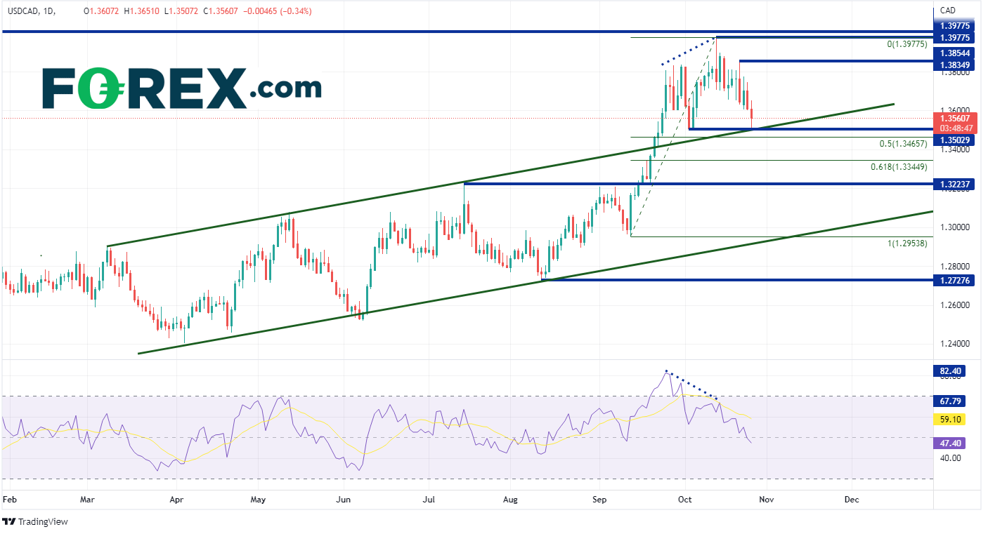 在日线图上,美元/加元已跌至关键支撑位,即104日低点和之前上行通道的顶部交汇处1.3502附近。从913日低点到1013日高点区间的50%回撤位略低于1.3466,然后是同一区间的61.8%斐波纳契回撤位1.3345。但如果交易者将此视为在下周FOMC会议前买入美元的机会,则第一个阻力位在1021日的高点1.3854,然后是1013日的高点1.3978。如果价格继续走高,下一个阻力位在1.4007,即2020525日那一周的高点。
