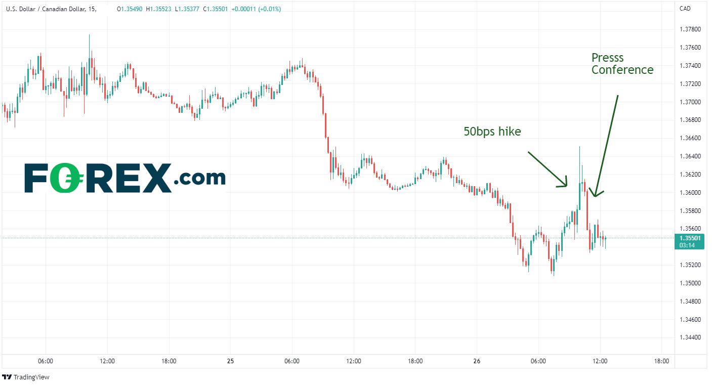 15分钟图上可以看出,美元/加元最初在加拿大央行宣布加息50个基点后,涨至日线高点1.3651。这是交易者可预见的低于预期的加息会引起的价格走势。然而,在新闻发布会开始后,该货币对跌至1.353,比利率决议公布前还低。因为根据麦克勒姆的发言,交易者判断127日可能会加息75个基点。
